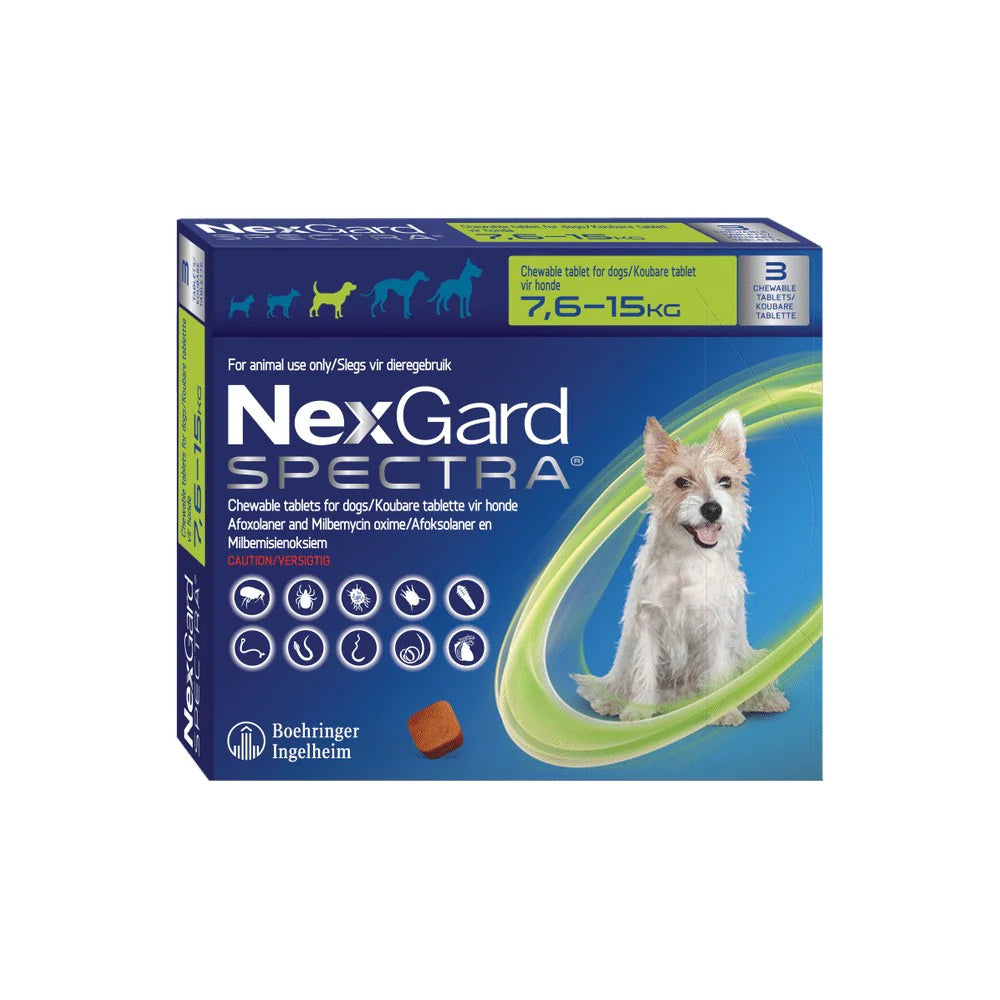 NexGard Spectra treats and controls 2 of the most common intestinal parasites in dogs, roundworms and hookworms.